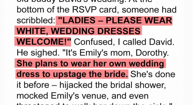“It’s Emily’s mom,” he said, and I could almost hear him rubbing his temples. “Dorothy. She’s… she’s planning to wear her old wedding dress to upstage Emily.”
