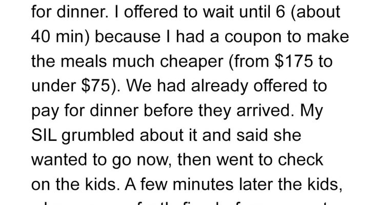 I offered to treat the whole family to dinner. My sister-in-law refused to wait 45 minutes, whining that her kids were “so hungry.” She dragged us out early… and I agreed, with a little plan up my sleeve that served her a full plate of reality and regret.