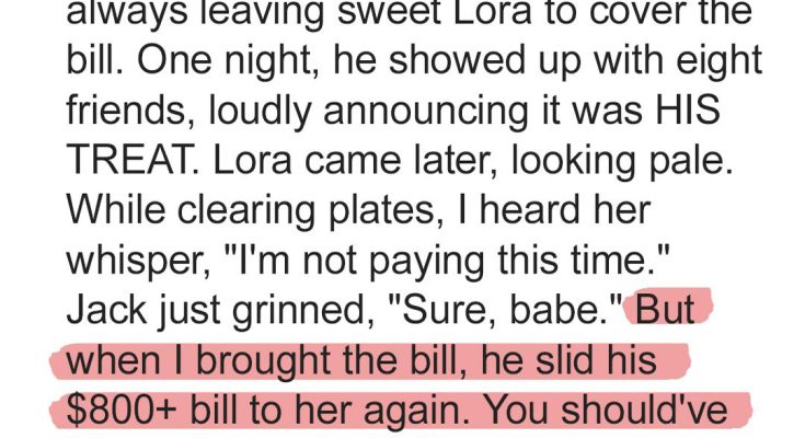 Eight hundred dollars plus. That’s what Jack’s “boys’ night out” bill came to, and he expected his wife, Lora, to foot it. Waitress Melanie, witnessing Lora’s despair, concocted a bold move to ensure Jack’s night didn’t end as he planned.
