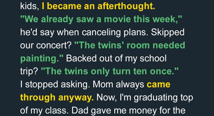 Graduation was approaching, and I was determined to make it count. I had clawed my way to the top of my class. Late nights, endless essays, and part-time jobs, it all paid off! I got into my dream college without Dad’s help. Mom was ecstatic! Dad… well, he was politely indifferent.