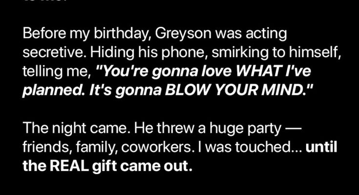 So when Greyson started acting mysterious about my birthday (hiding his phone with a smirk, dropping hints like, “You’re gonna love what I’ve planned. It’s gonna blow your mind”), I dared to hope for something sweet. Maybe even healing.