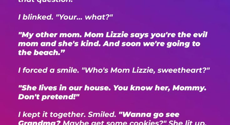 “Mom Lizzie says you’re the evil one,” she shrugged. “She’s the kind mom. And soon, we’re going to the ocean with Daddy.”