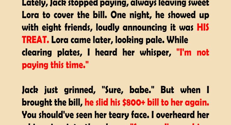 Eight hundred dollars plus. That’s what Jack’s “boys’ night out” bill came to, and he expected his wife, Lora, to foot it. Waitress Melanie, witnessing Lora’s despair, concocted a bold move to ensure Jack’s night didn’t end as he planned.