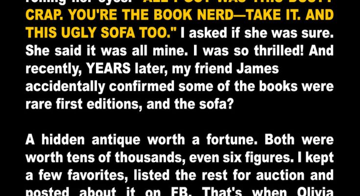 When my cousin gave me our grandma’s old books and worn-out sofa, she called it junk. Years later, a shocking discovery changed everything, and she suddenly wanted it all back. What she didn’t expect was the one thing I had that could turn it all around.