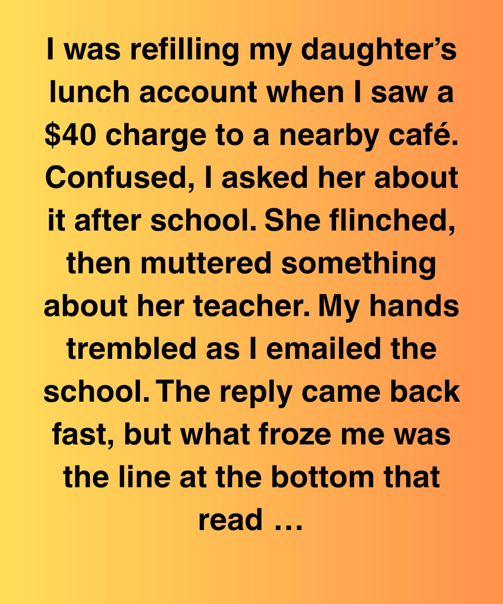I was refilling my daughter’s lunch account when I saw a $40 charge to a nearby café. Confused, I asked her about it after school. She flinched, then muttered something about her teacher. My hands trembled as I emailed the school. The reply came back fast, but what froze me was the line at the bottom that read: “Please let me know if you’d like to discuss this in person. I believe Ms. Varela has already reached out to you.”