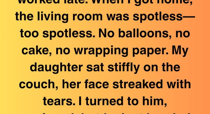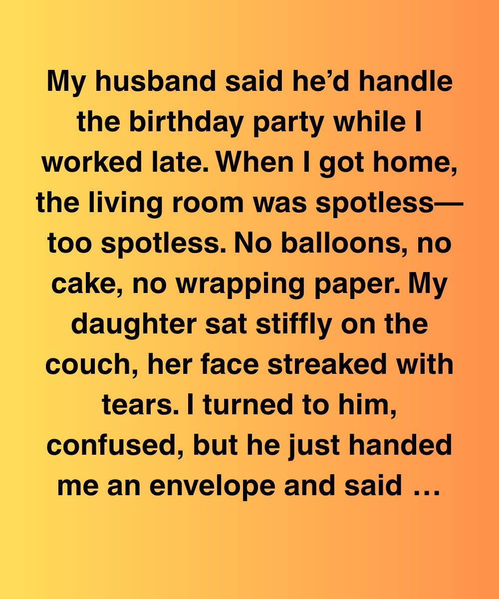 My husband said he’d handle the birthday party while I worked late. When I got home, the living room was spotless—too spotless. No balloons, no cake, no wrapping paper. My daughter sat stiffly on the couch, her face streaked with tears. I turned to him, confused, but he just handed me an envelope and said, “We need to talk.”