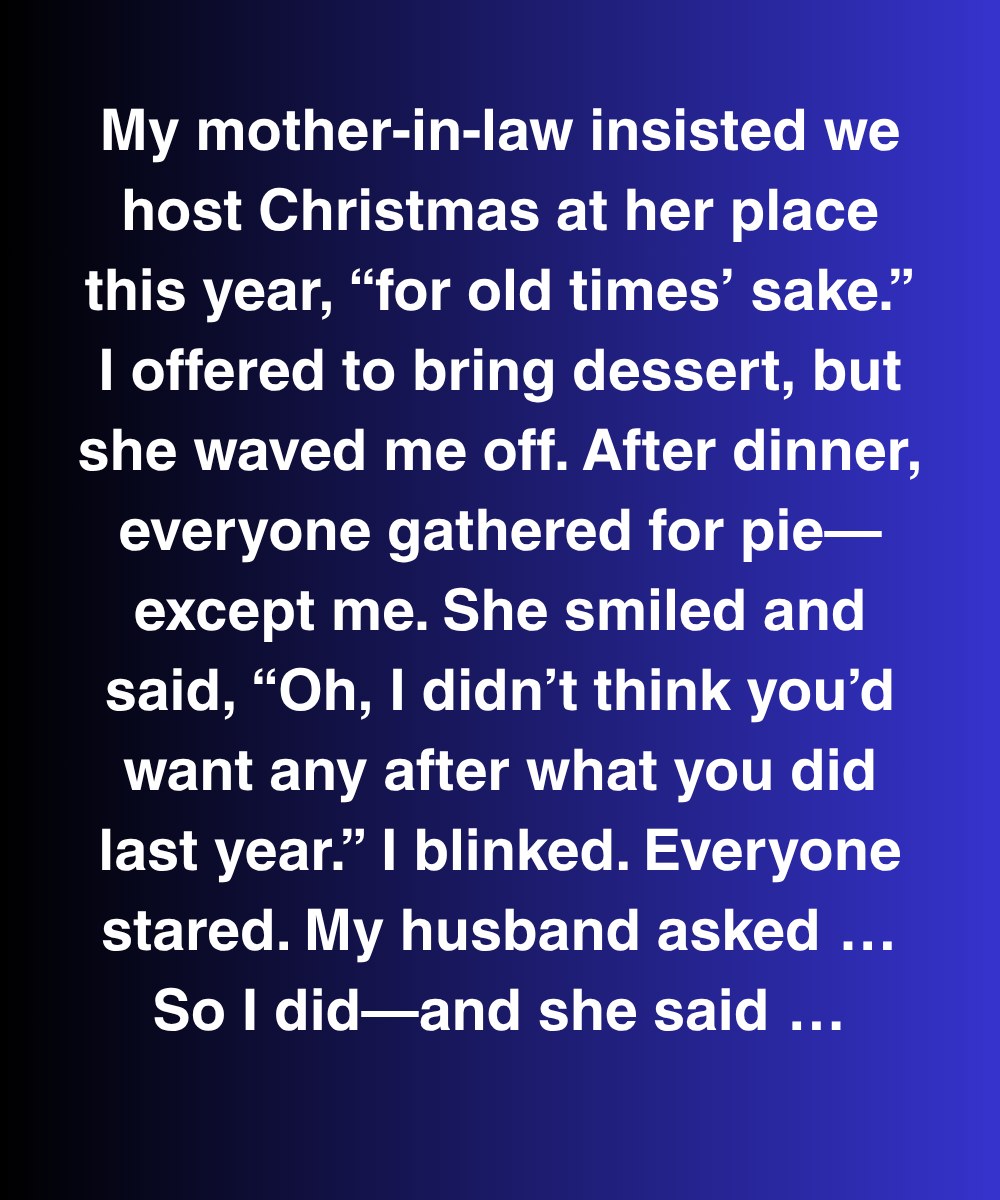 My mother-in-law insisted we host Christmas at her place this year, “for old times’ sake.” I offered to bring dessert, but she waved me off. After dinner, everyone gathered for pie—except me. She smiled and said, “Oh, I didn’t think you’d want any after what you did last year.” I blinked. Everyone stared. My husband asked, “Wait—what did she do last year?”