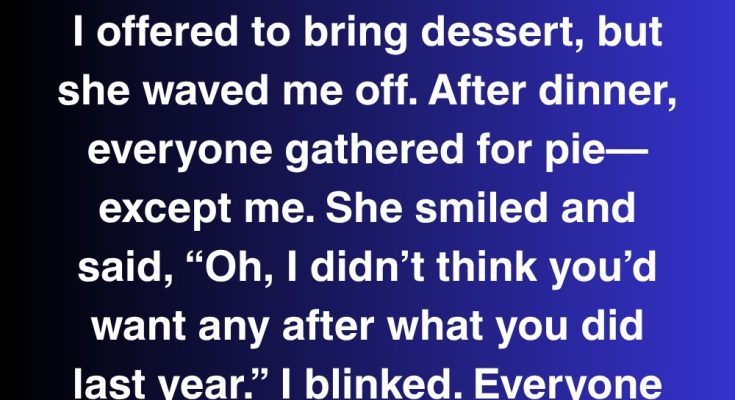 My mother-in-law insisted we host Christmas at her place this year, “for old times’ sake.” I offered to bring dessert, but she waved me off. After dinner, everyone gathered for pie—except me. She smiled and said, “Oh, I didn’t think you’d want any after what you did last year.” I blinked. Everyone stared. My husband asked, “Wait—what did she do last year?”