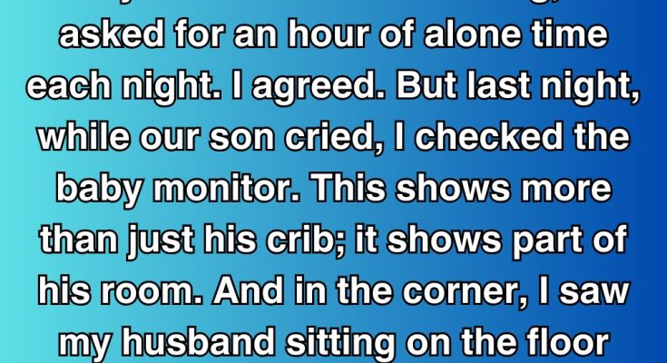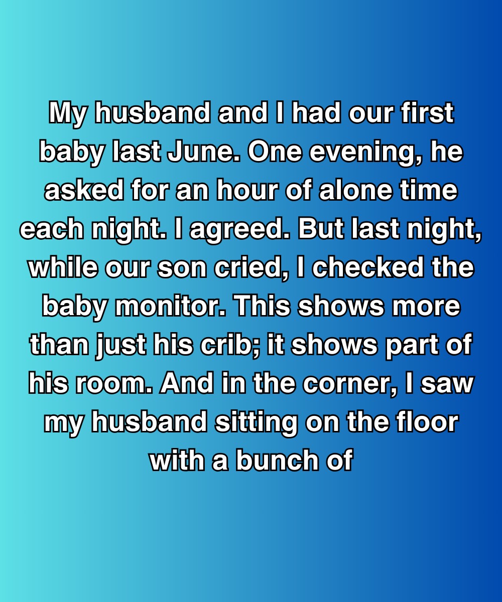 My husband and I had our first baby last June. One evening, he asked for an hour of alone time each night. I agreed. But last night, while our son cried, I checked the baby monitor. This shows more than just his crib; it shows part of his room. And in the corner, I saw my husband sitting on the floor with a bunch of photo albums, whispering something under his breath.