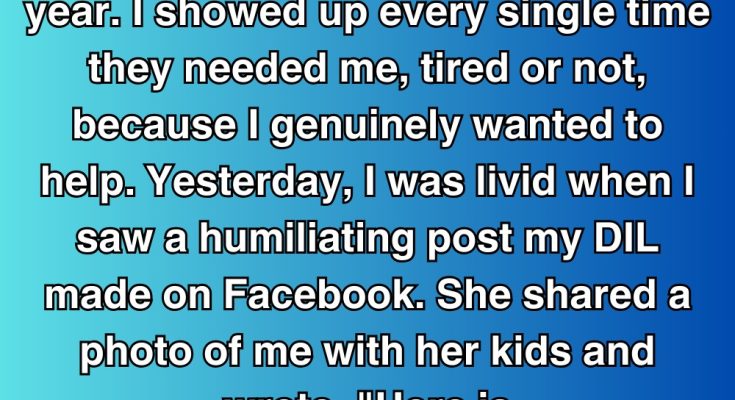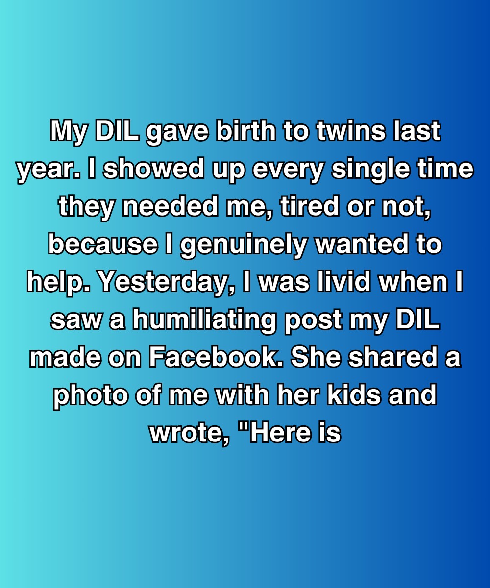My DIL gave birth to twins last year. I showed up every single time they needed me, tired or not, because I genuinely wanted to help. Yesterday, I was livid when I saw a humiliating post my DIL made on Facebook. She shared a photo of me with her kids and wrote, “Here is the live-in nanny we don’t pay but still have to deal with.”