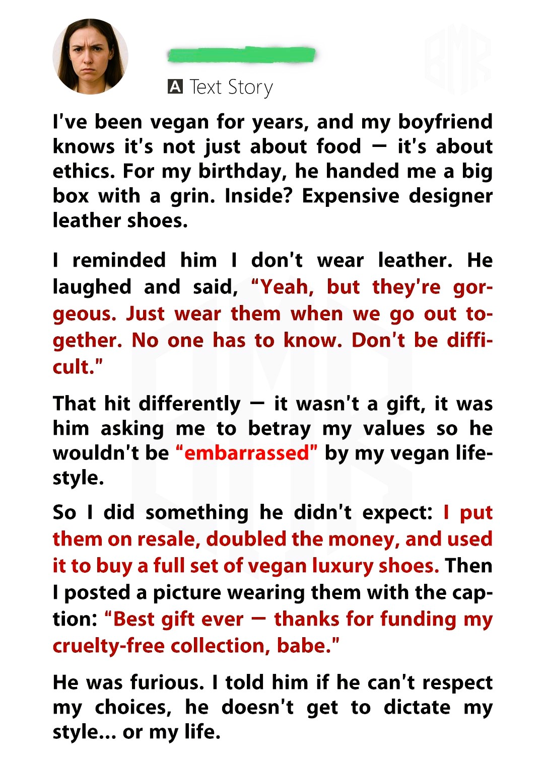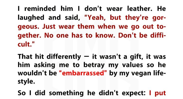 I’ve been vegan for years—not just in diet, but in principle. My boyfriend always claimed to respect that. So when he handed me a glossy designer box for my birthday, I was excited. But inside were leather shoes. Real leather. I froze. He laughed and said, “They’re gorgeous. Just wear them when we go out. No one has to know. Don’t be difficult.” That wasn’t a gift—it was a request to betray my ethics so he wouldn’t be embarrassed. I felt gutted. This wasn’t about shoes. It was about respect, and he’d just trampled mine.