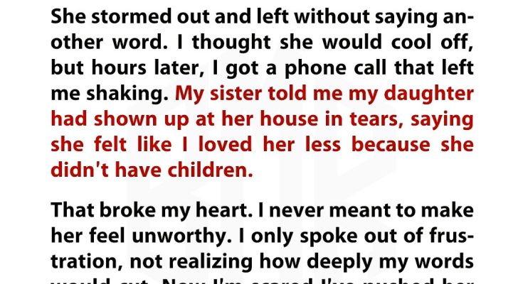 That shattered me. I never meant to make her feel less than. I spoke from frustration, not cruelty, but my words clearly cut deep. I’d been longing for grandkids and watching others become grandparents stirred something bitter in me. I didn’t realize I was projecting that onto her, making her feel like she had to earn my love through motherhood.