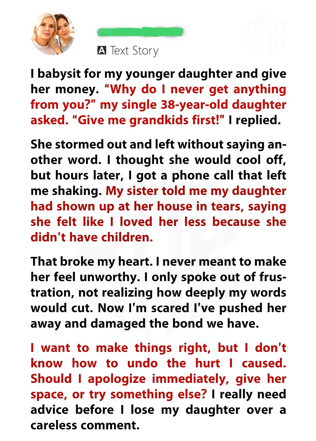 I’ve always tried to be a supportive mother, especially to my younger daughter who has kids—I babysit, help financially, and stay involved. But when my older daughter, 38 and single, asked why I never help her, I snapped. “Give me grandkids first,” I said. She left without a word, and I thought she’d cool off. Instead, my sister called hours later—my daughter had shown up crying, saying she felt unloved because she hadn’t become a mother.