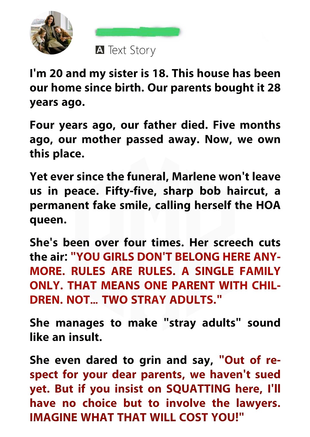 I’m Claire, 20, and my sister Iris is 18. After our parents died—Dad from a heart attack, Mom from cancer—we clung to the only home we’d ever known. Every corner held memories: blanket forts during thunderstorms, Dad’s barbecue summers, Mom’s banana bread scent drifting through the halls. It wasn’t just a house—it was our sanctuary, our history. But grief wasn’t the only storm we faced. The HOA knocked, not with condolences, but with eviction threats. They said we violated “single-family” rules. We were sisters, not enough to count. And just like that, our home was under siege.