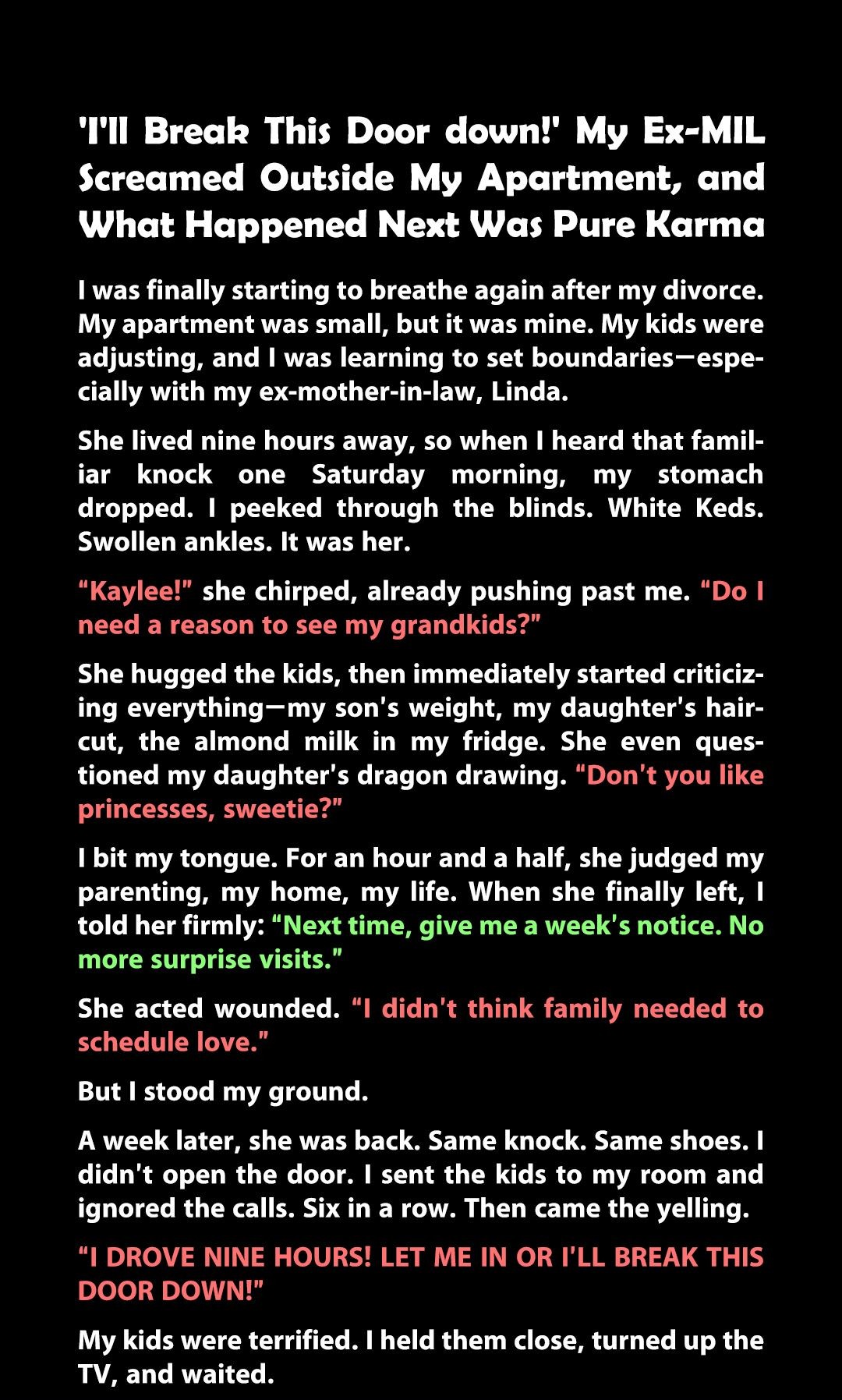 A week later, Linda was back, pounding on my door. I didn’t answer. I’d told her clearly: no surprise visits. She called six times, then screamed through the door, threatening to break it down. My kids were terrified. I moved them to the bedroom and turned up the volume to drown out her rage. Then came a knock—this time from the police. Linda had filed a false wellness check, claiming she hadn’t heard from me in days. I opened the door, let the officers in, and calmly explained everything. Linda stood behind them, smug and manipulative.