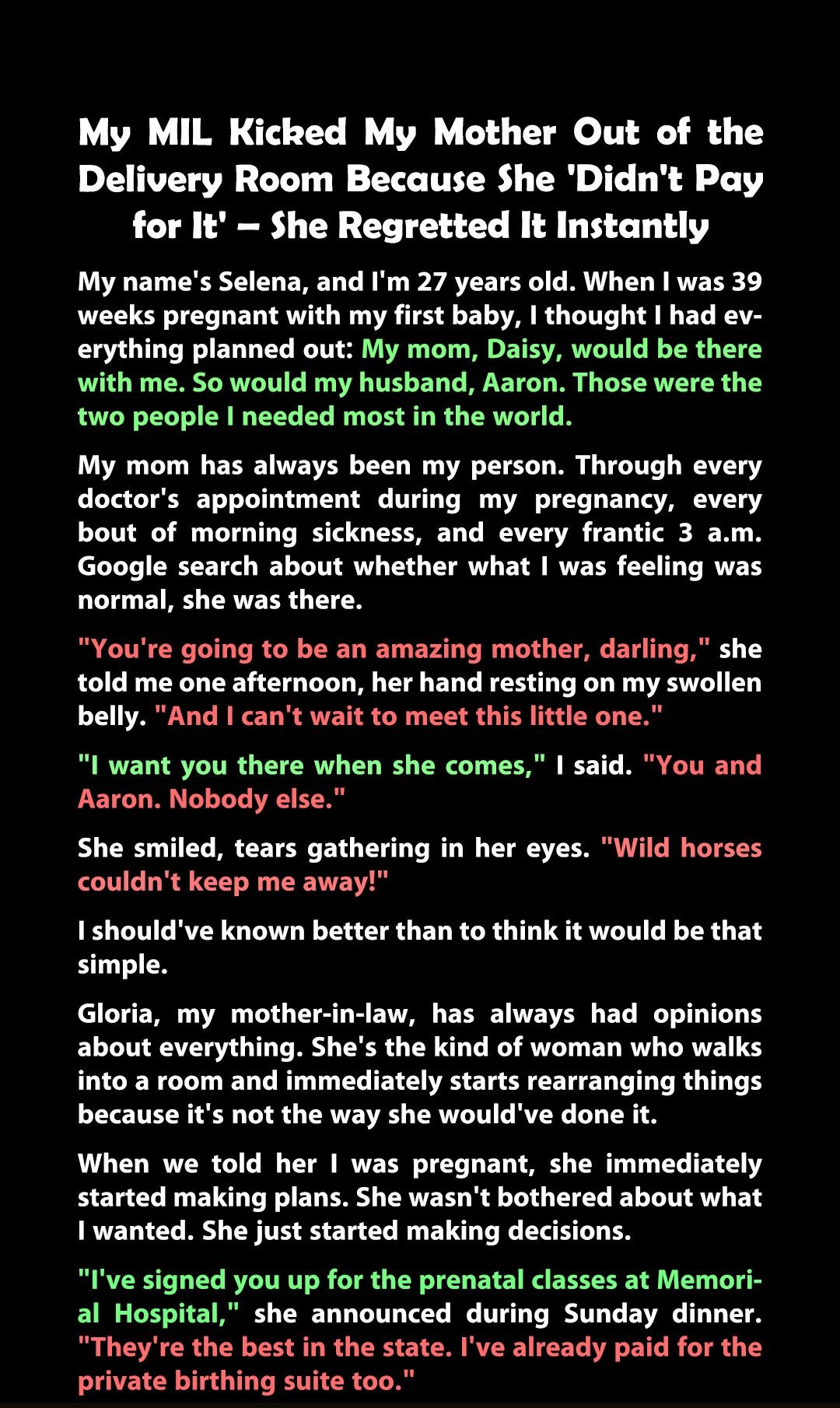 I thought the hardest part of giving birth would be the contractions—but nothing prepared me for the emotional ambush my mother-in-law unleashed. I had planned for my mom and my husband to be by my side during labor. My mom had supported me through every step of pregnancy, and I needed her calm presence. But when Gloria, my MIL, barged into the delivery room uninvited, she demanded my mother leave, claiming she had “paid for everything” and deserved to be there more. I was in pain, vulnerable, and shocked. But what hurt most was watching my mom’s face crumble as she quietly stepped back.