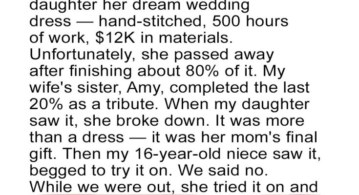 My late wife spent 500 hours hand-sewing the perfect wedding dress for our daughter. It cost $12,000 and was her final act of love before she passed away. Last week, my 16-year-old niece destroyed it in minutes. What happened next still gives me chills.