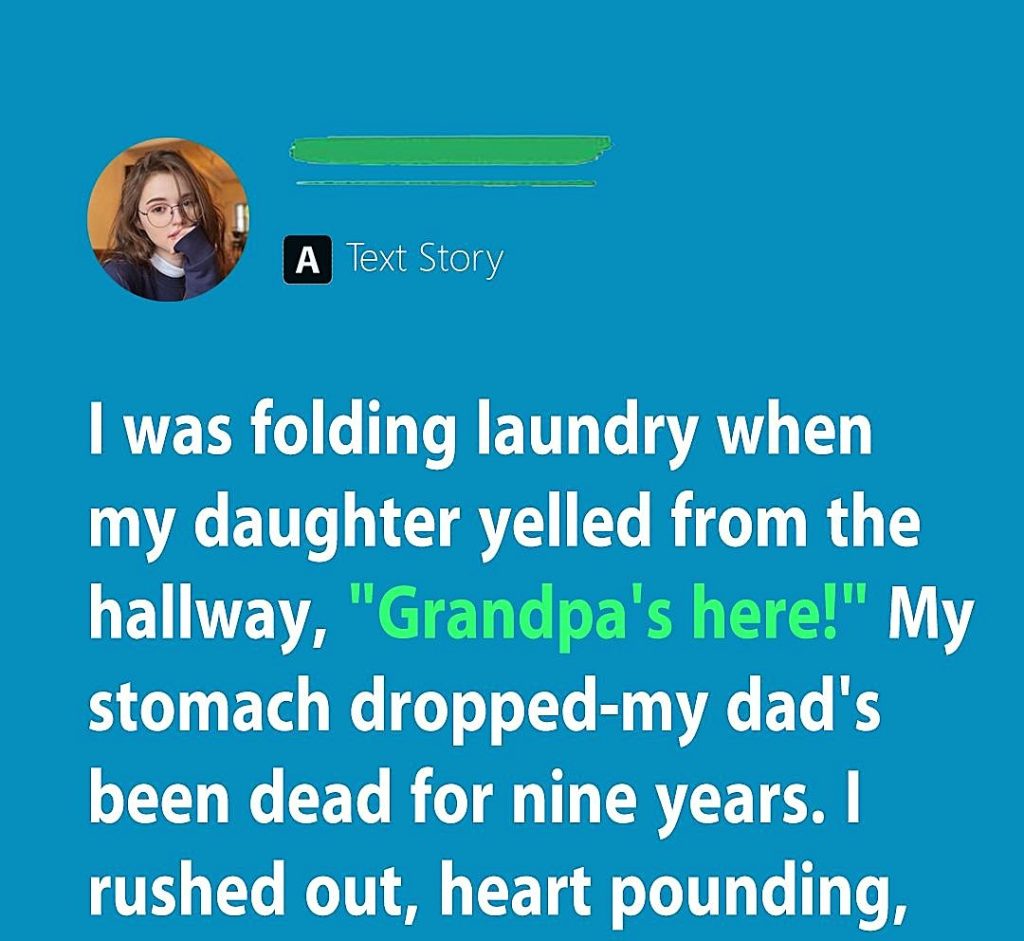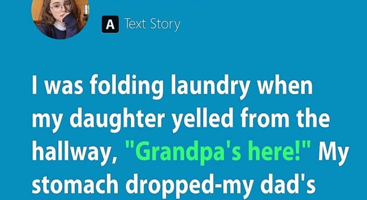 I was folding laundry when my daughter yelled from the hallway, “Grandpa’s here!” My stomach dropped—my dad’s been dead for nine years. I rushed out, heart pounding, but she pointed calmly to the front door. I opened it and gasped. Standing there, holding a box labeled with my maiden name, was a man who looked just like my father.