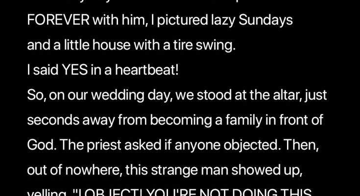 She walked down the aisle holding her father’s hand while everyone looked at her. Once she reached the altar, the priest began reading the wedding vows. Then, he asked the guests if anyone was against the marriage.