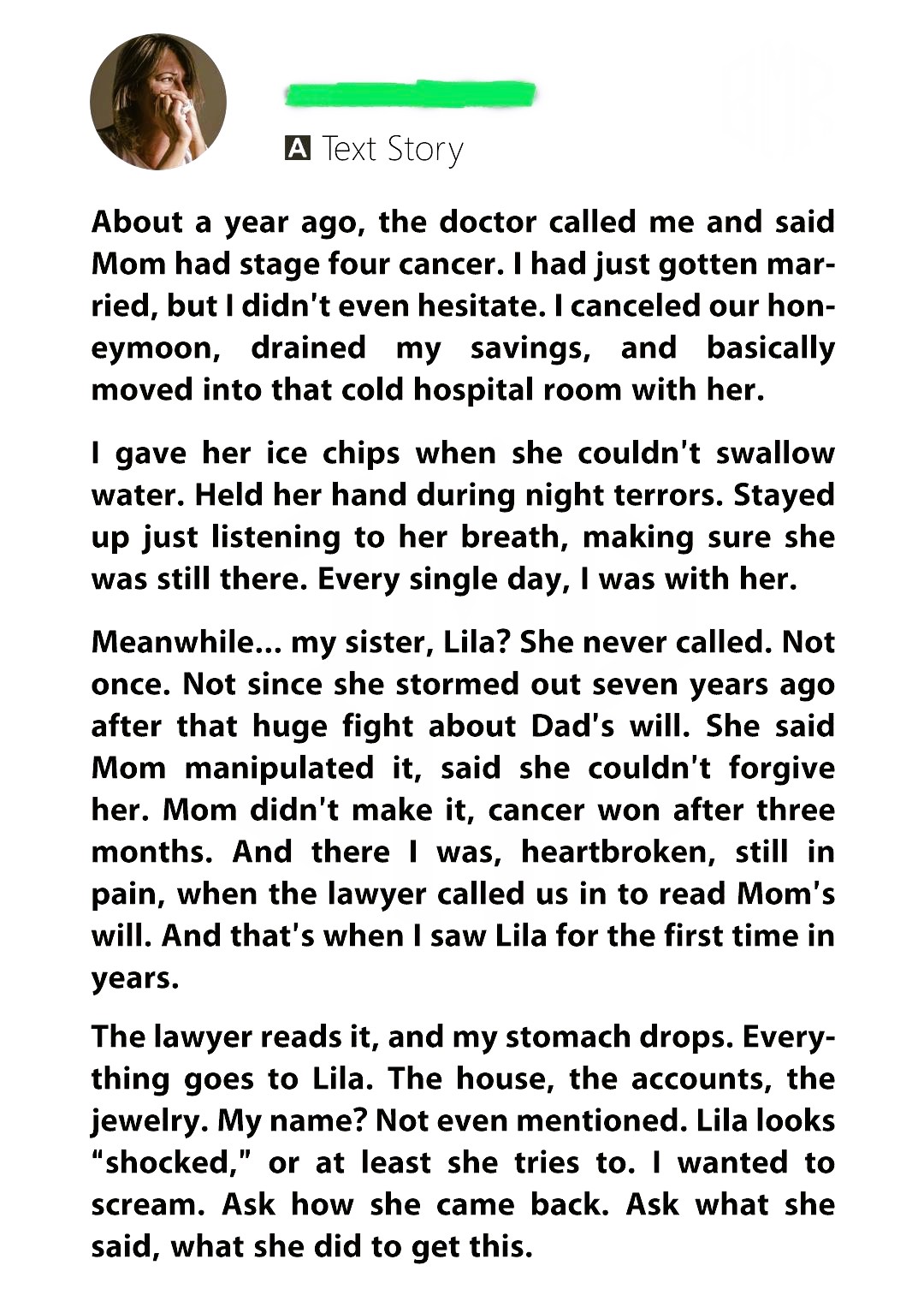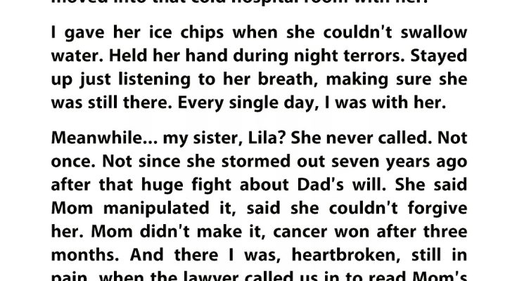 I had just gotten married when the doctor told me Mom had stage four cancer. Without hesitation, I canceled our honeymoon, drained my savings, and moved into her hospital room. I fed her ice chips when she couldn’t swallow, held her hand through night terrors, and stayed awake just to hear her breathe. I gave her everything—my time, my heart, my hope. Meanwhile, my sister Lila, estranged for seven years after a fight over Dad’s will, never called. Not once. I was alone in that room, watching Mom slip away, believing love would be enough.
