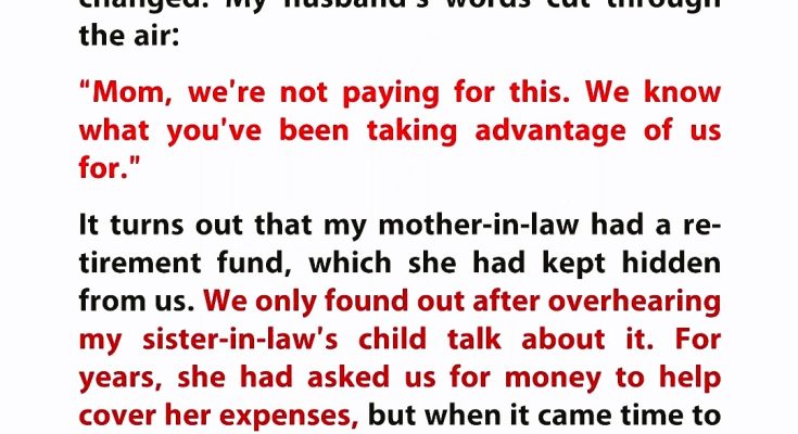 The truth had slipped out weeks earlier—my niece casually mentioned Grandma’s retirement fund. We were floored. All those years of “I need help” and “I can’t afford it” suddenly felt like manipulation. When confronted, my MIL deflected, saying she had to help her daughter. My husband asked, “But I’m your son too, right?” Her tears came fast, followed by blame—directed at me. She accused me of turning him against her. I didn’t flinch. I stood by him. Because loyalty isn’t blind—it’s earned, and hers had run dry.