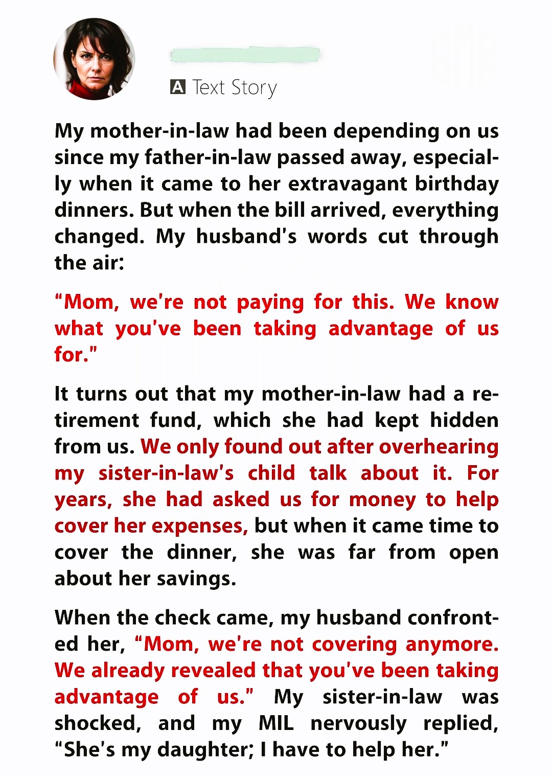For years, my husband and I quietly footed the bill for my mother-in-law’s lavish birthday dinners. Ever since my father-in-law passed, she leaned on us financially, and we never questioned it—until this year. At her 68th celebration, the check arrived and my husband finally spoke up. “Mom, we’re not paying for this. We know you’ve been taking advantage of us.” His voice was calm, but firm. The room froze. My sister-in-law looked stunned. And I sat there, heart pounding, knowing this moment had been building for far too long.