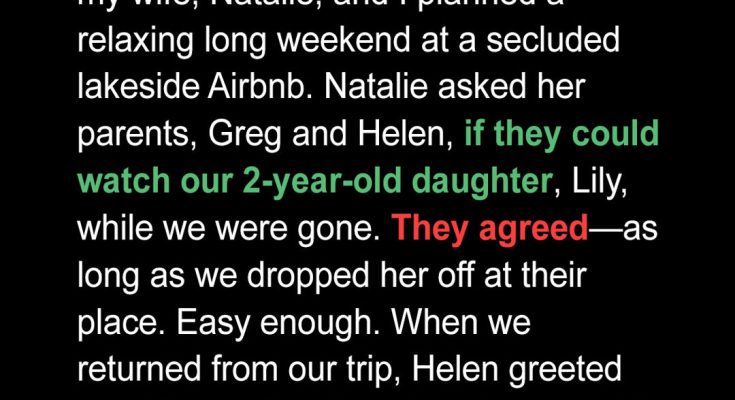 Natalie suggested her parents, Greg and Helen, watch Lily while we were gone. I didn’t love the idea, but they’d babysat before, and we trusted them enough for a couple of days.