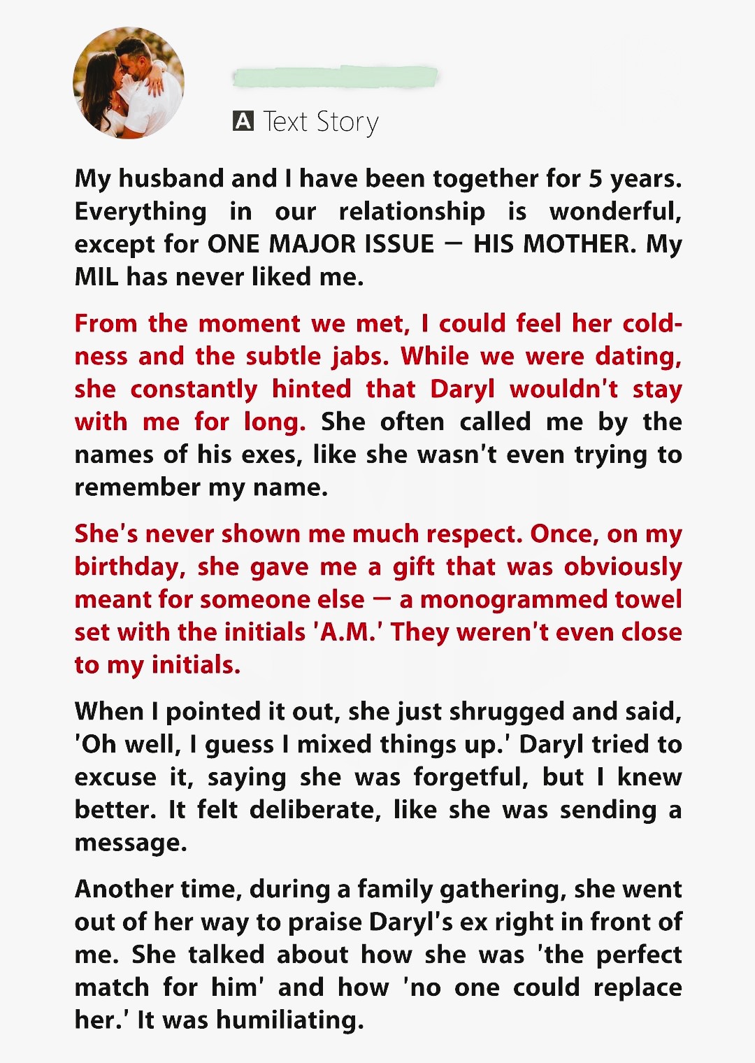 My husband Daryl and I have been together for five years, and while our relationship is strong, his mother has been a constant source of tension. From the moment we met, she made it clear I wasn’t welcome—calling me by his exes’ names, giving me gifts meant for someone else, and undermining me at every turn. I tried to be gracious, but her passive-aggressive behavior chipped away at my patience. She’d praise his exes in front of me, criticize my cooking, and mock my career. No matter how kind I was, she refused to meet me halfway.