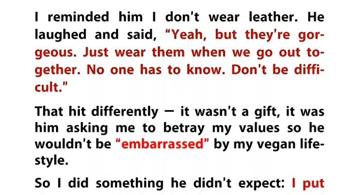 I’ve been vegan for years—not just in diet, but in principle. My boyfriend always claimed to respect that. So when he handed me a glossy designer box for my birthday, I was excited. But inside were leather shoes. Real leather. I froze. He laughed and said, “They’re gorgeous. Just wear them when we go out. No one has to know. Don’t be difficult.” That wasn’t a gift—it was a request to betray my ethics so he wouldn’t be embarrassed. I felt gutted. This wasn’t about shoes. It was about respect, and he’d just trampled mine.