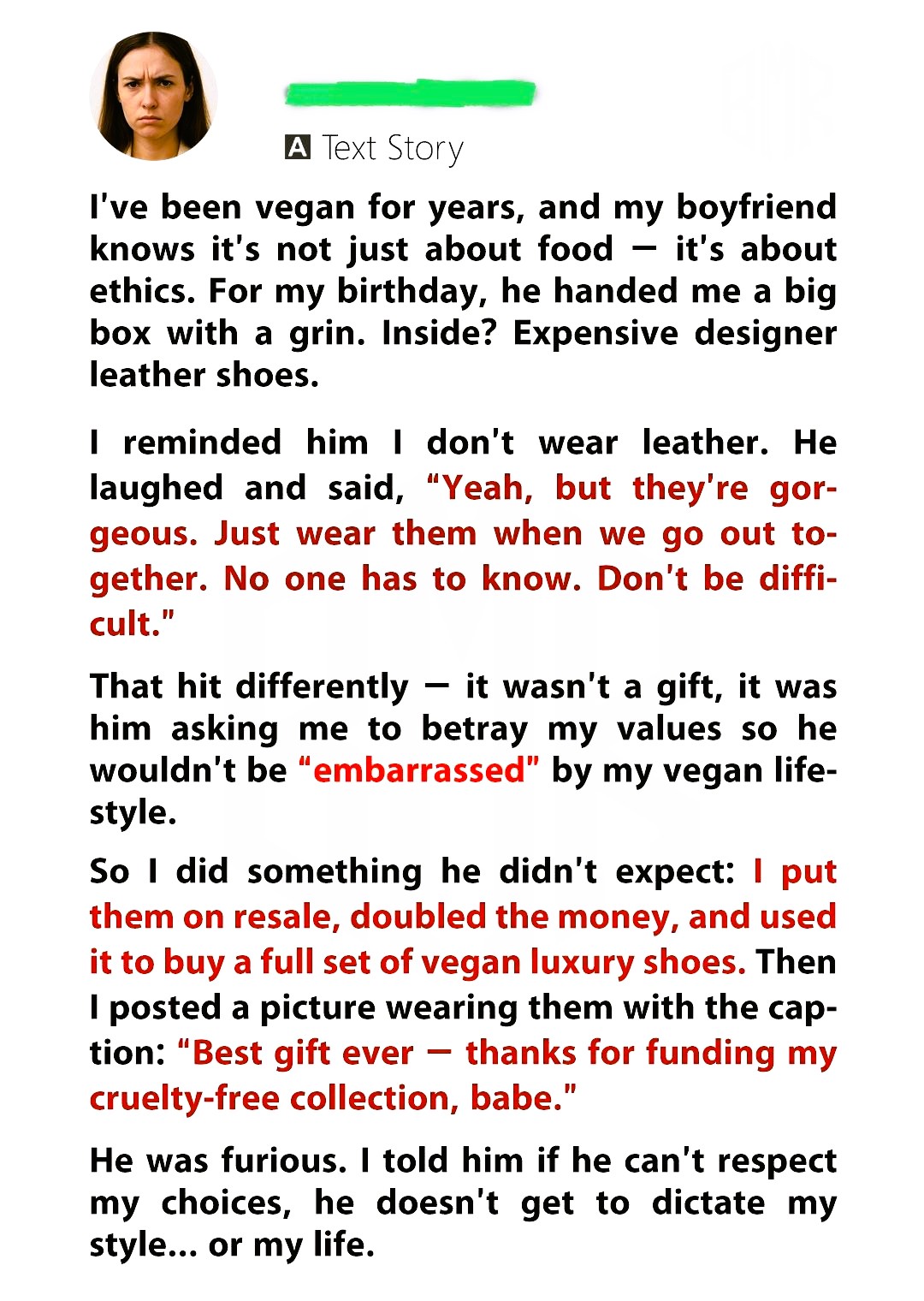 I didn’t yell. I didn’t cry. I acted. I listed the shoes online, sold them for double, and used the money to buy a full set of vegan luxury footwear. Then I posted a photo wearing my new cruelty-free boots with the caption: “Best gift ever—thanks for funding my ethical collection, babe.” He saw it. He was livid. But I didn’t flinch. If he couldn’t honor my values, he didn’t get to dictate my style—or my silence. That post wasn’t petty. It was a boundary drawn in bold.
