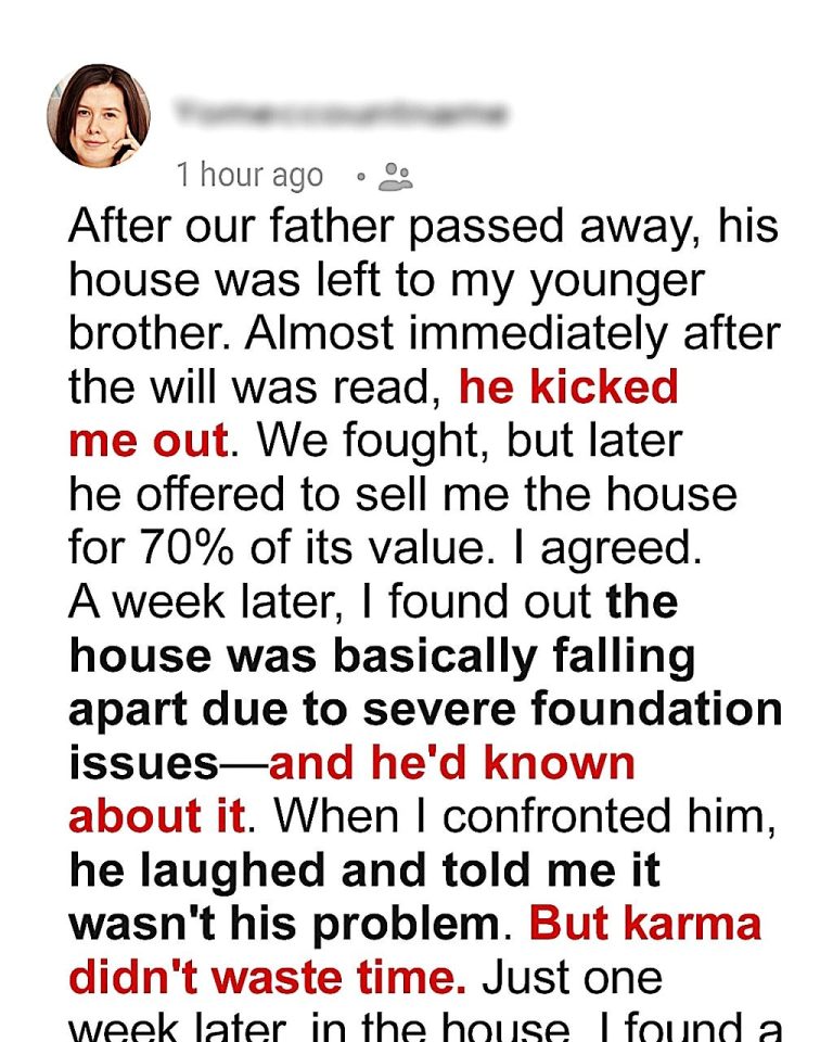 Three years after our father’s death, my brother sold our childhood home to me in a rush and at a discount. But two days after the sale, I found out the house was damaged beyond repair and that my brother had known all along. He took my trust for granted. Karma didn’t.