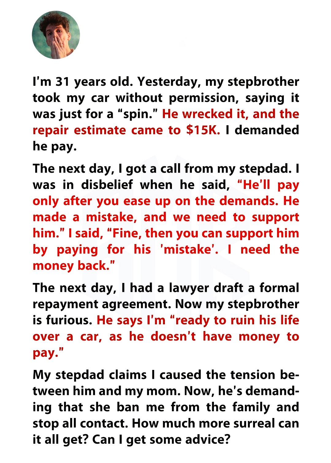 I’m 31, and yesterday my stepbrother took my car without asking—just for a “spin,” he said. That spin ended in a wreck, and now I’m staring at a $15,000 repair bill. I demanded he pay, but instead of remorse, I got excuses. My stepdad called, asking me to “ease up” because my stepbrother “made a mistake.” I told him if he wanted to support his son, he could pay for the mistake himself.