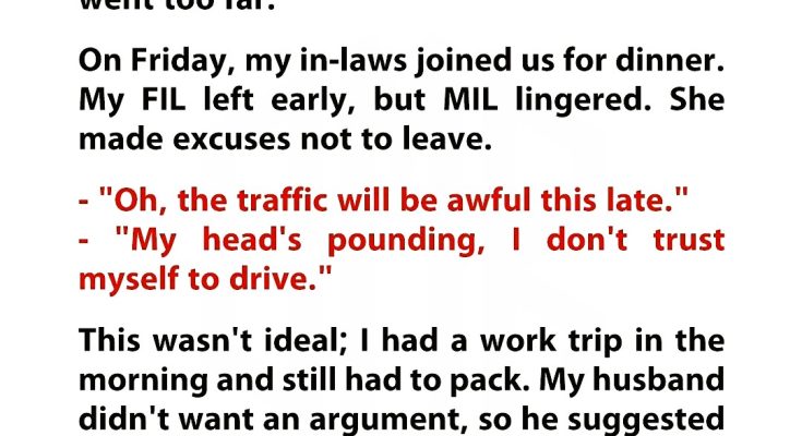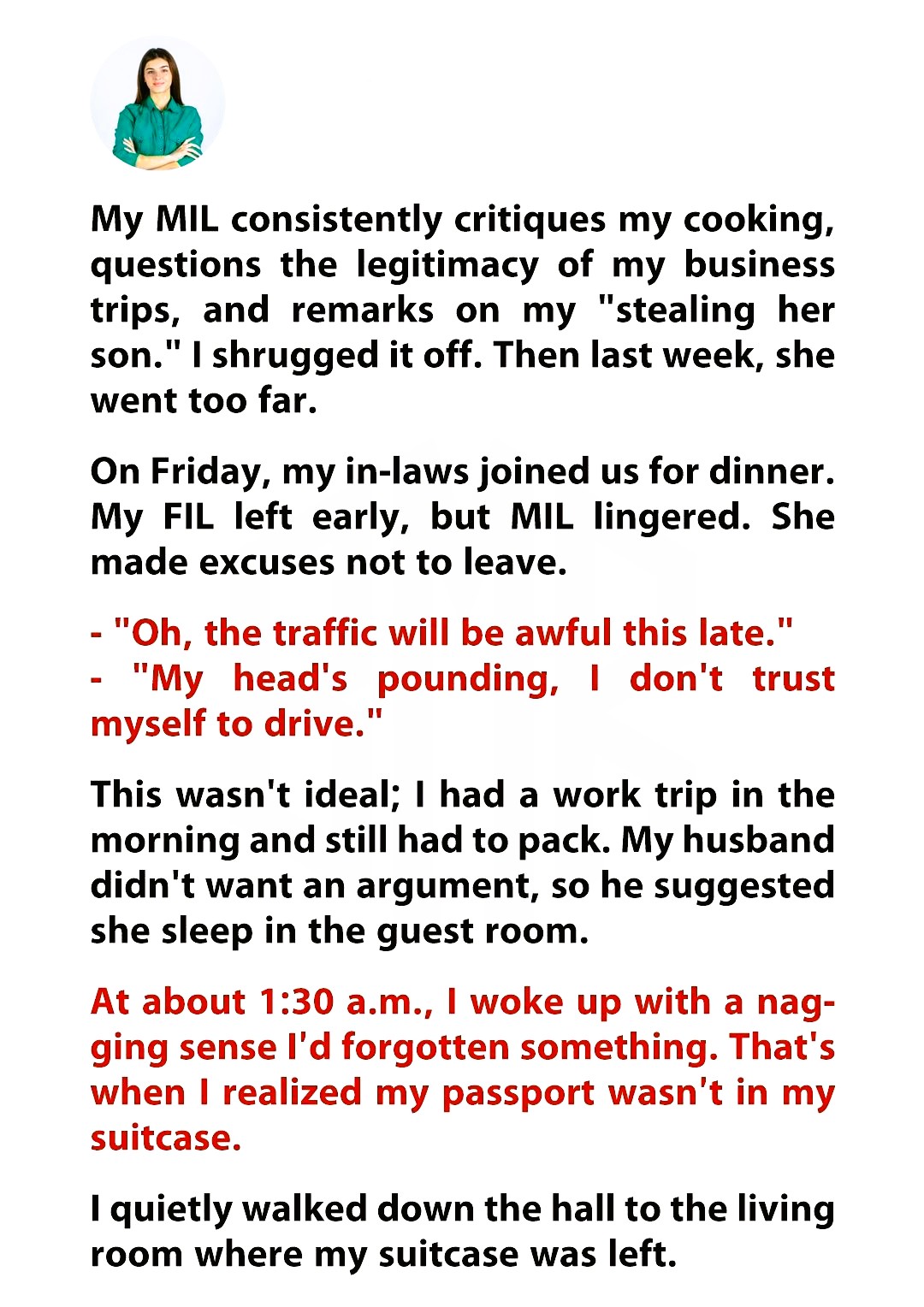 The night before my work trip, I woke up with a jolt—my passport was still in my jewelry box. As I tiptoed toward the guest room to retrieve it, I saw light spilling from the cracked door. Inside, my mother-in-law knelt beside my suitcase, rummaging through my clothes. At first, I thought she was just snooping. But then she pulled out black lace lingerie, a flirty note, and a man’s tie—none of it mine. My stomach dropped. She was planting evidence to make it look like I was cheating on Dave.