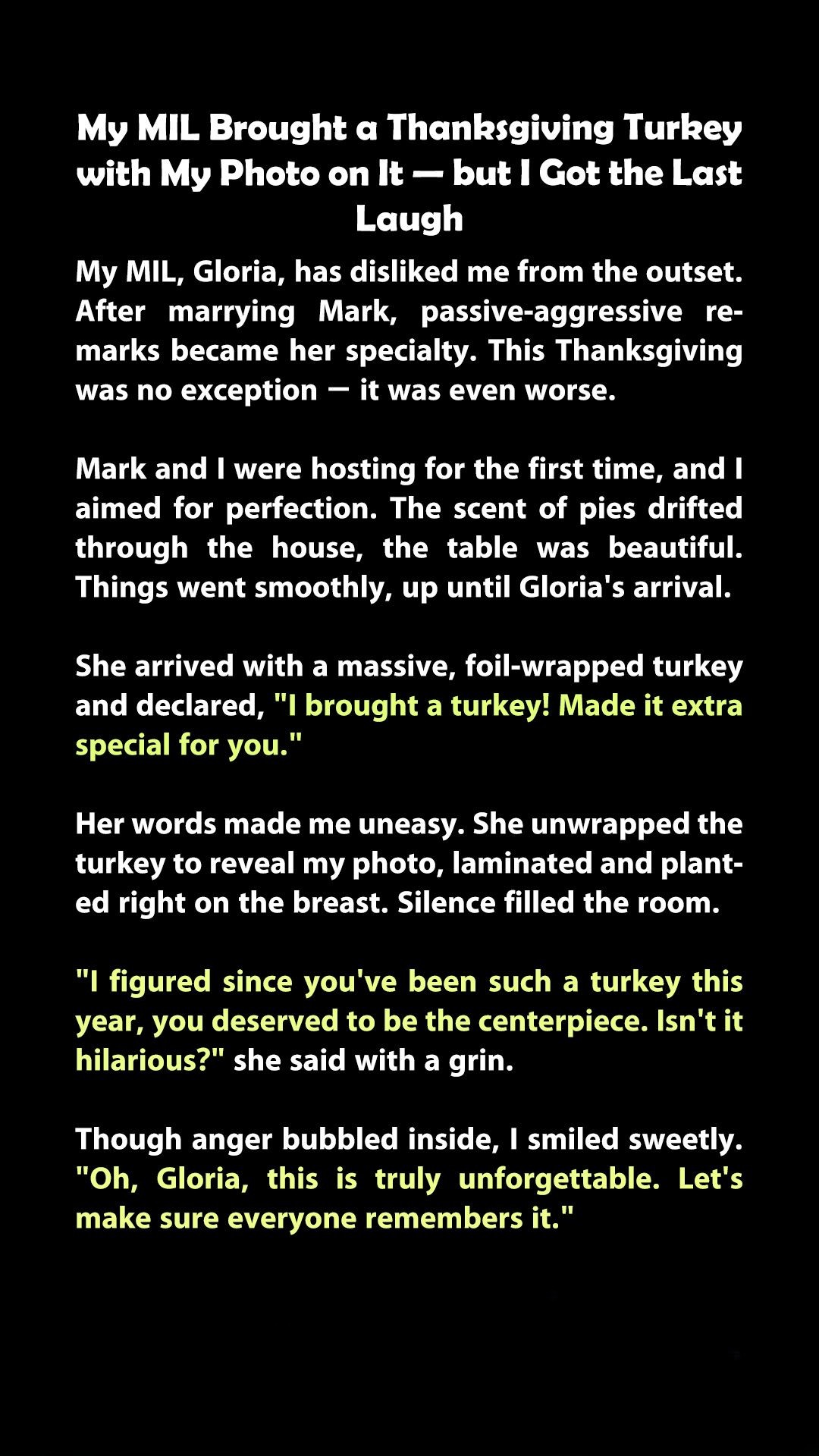 That night, I created a Facebook event: “Gloria’s Annual Turkey Roast.” I tagged her friends, uploaded the photo, and captioned it: “Book your custom ‘turkey selfie’ now for Christmas!” Comments poured in—some amused, some horrified. Her church group prayed for her creative journey. Someone asked for a turkey with their ex-husband’s face. By morning, Gloria was infamous. She stormed to my door, livid. “People think I’m insane!” she screamed. I just smiled. “Actions have consequences.” Even Mark, my husband, backed me up. Gloria had finally met her match.