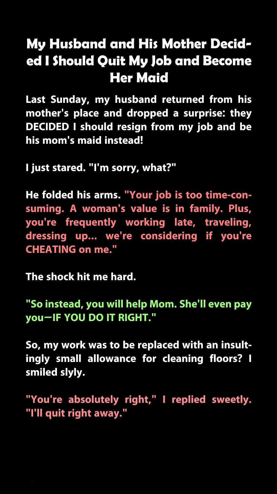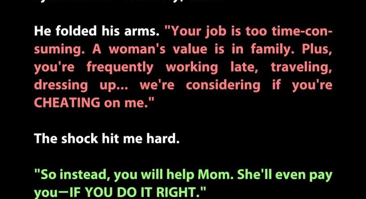Sophia thought her marriage to Ethan was built on mutual respect. For two years, she balanced a thriving career as a financial consultant with a peaceful home life. But everything unraveled one Sunday afternoon when Ethan returned from visiting his mother, Diane, and delivered a bombshell: he and Diane had decided Sophia should quit her job and become Diane’s full-time housekeeper.